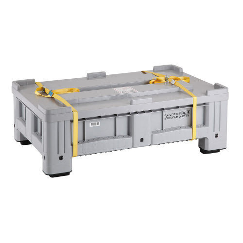 Plastikowa skrzynia z kodem UN, pokrywką i paskami 1200 x 1000 x 580 mm